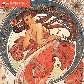 Alphonse Mucha 2018 12 x 12 Inch Monthly Square Wall Calendar with Glitter Flocked Cover by Flame Tree, Czech Art Nouveau Artist Painter Illustrator Designer